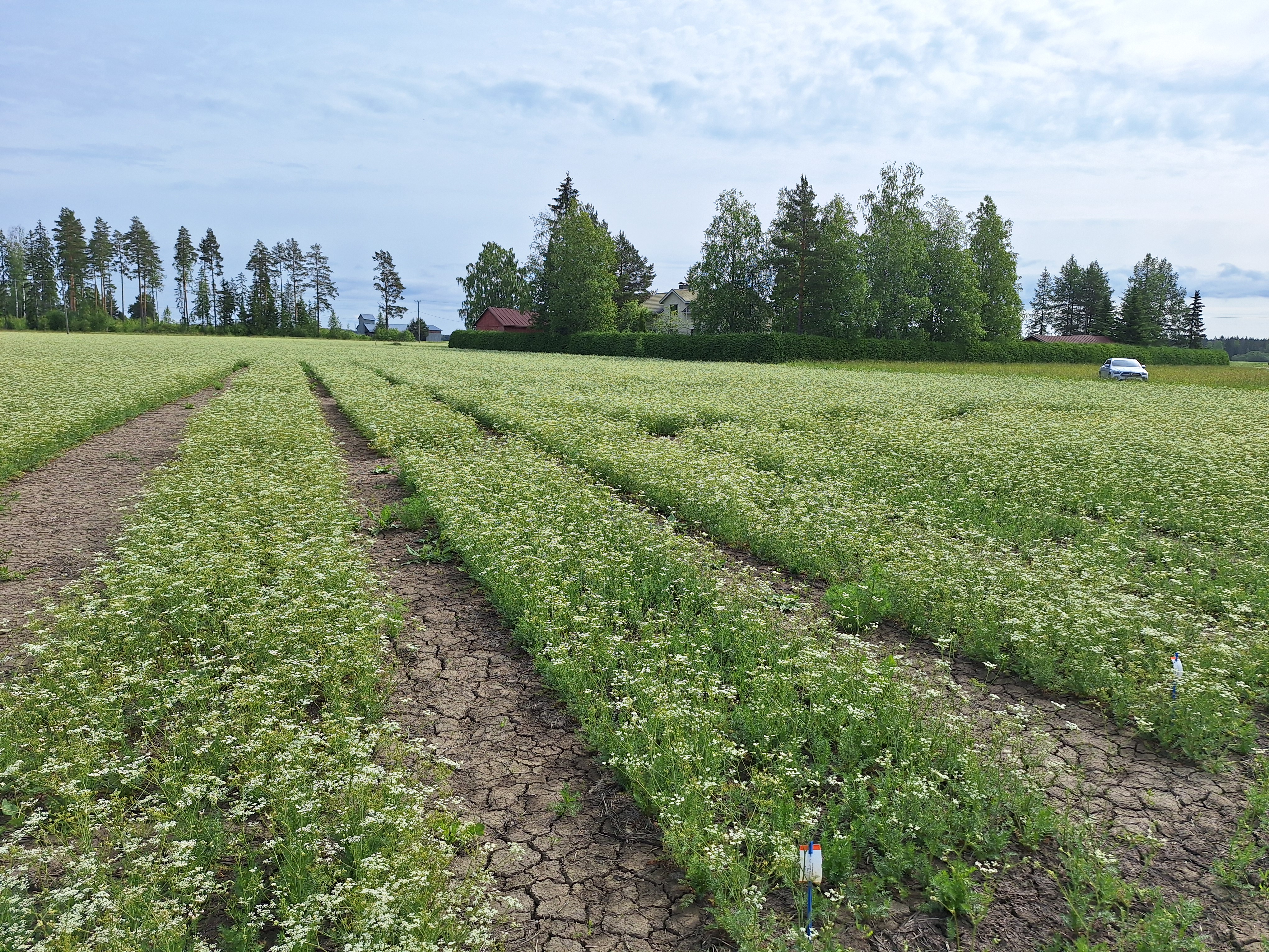 Kuva kuminalajikekokeesta kukinnan vielä jatkuessa.