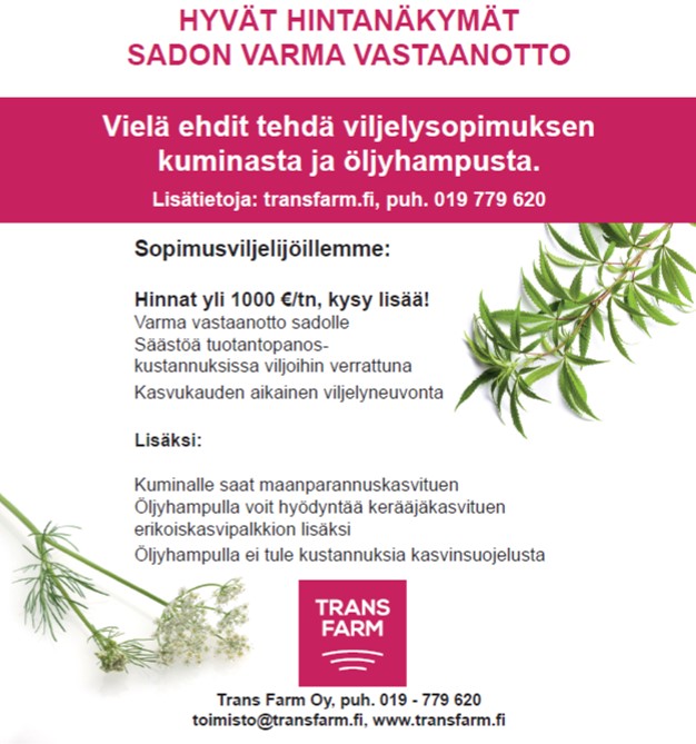 Erikoiskasvimme ovat nyt hyvässä suhdanteessa. Sekä kuminan että öljyhampun kipuavat yli tuhannen euron tonnilta.