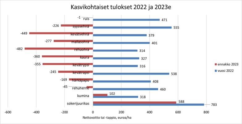 Kuva: Kasvintuotannon taloudellinen tulos nettovoittona tai -tappiona ilmaistuna ProAgria Lohkotietopankin aineistojen mukaan. Vuoden 2022 tulos on toteutuneista tuotantokustannuslaskelmista ja vuoden 2023 on laskettu ennakkotulos. Nettovoitto tai -tappio kuvastaa taloudellista tulosta, jossa kaikista tuotoista (satotuotot ja tuet) on vähennetty kaikki kustannukset (muuttuvat, työ ja kiinteät kulut). Lähde: ProAgria 28.11.2023