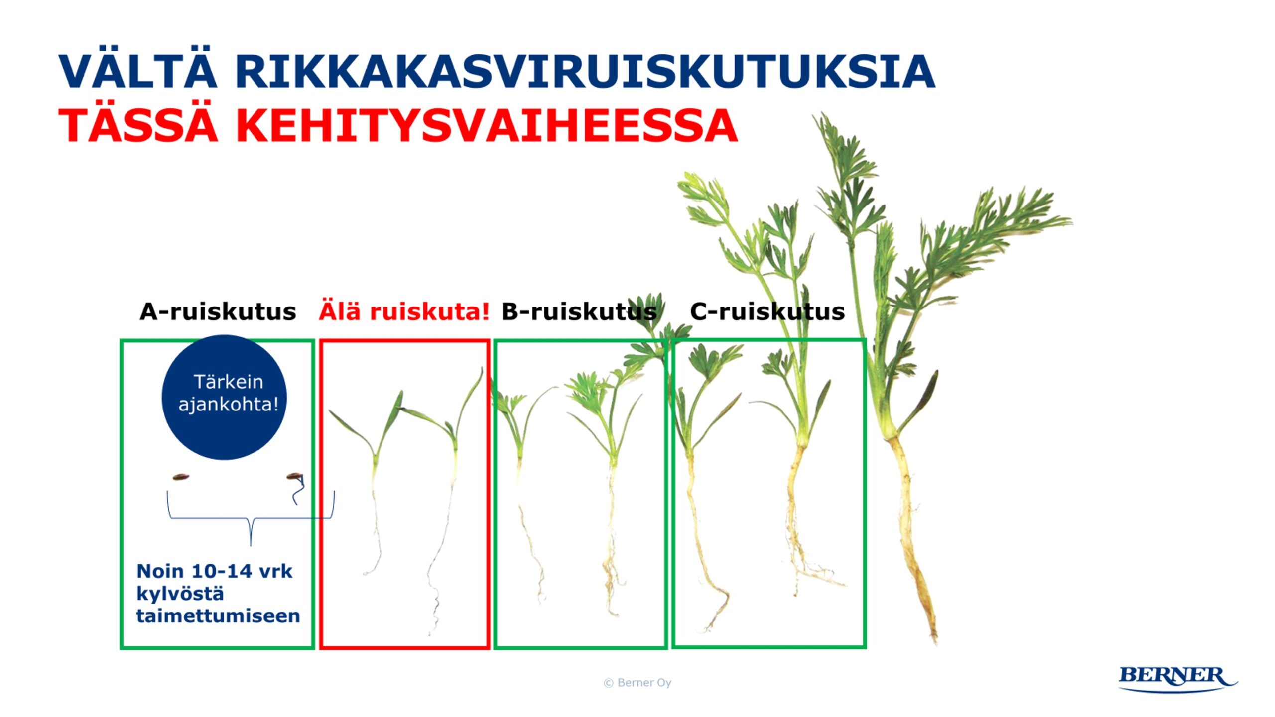 Onnistuneeseen lopputulokseen päästään jaetuin tankkiseoksin. Ruiskutuskertoja voi olla 2 – 3 tarpeen mukaan.