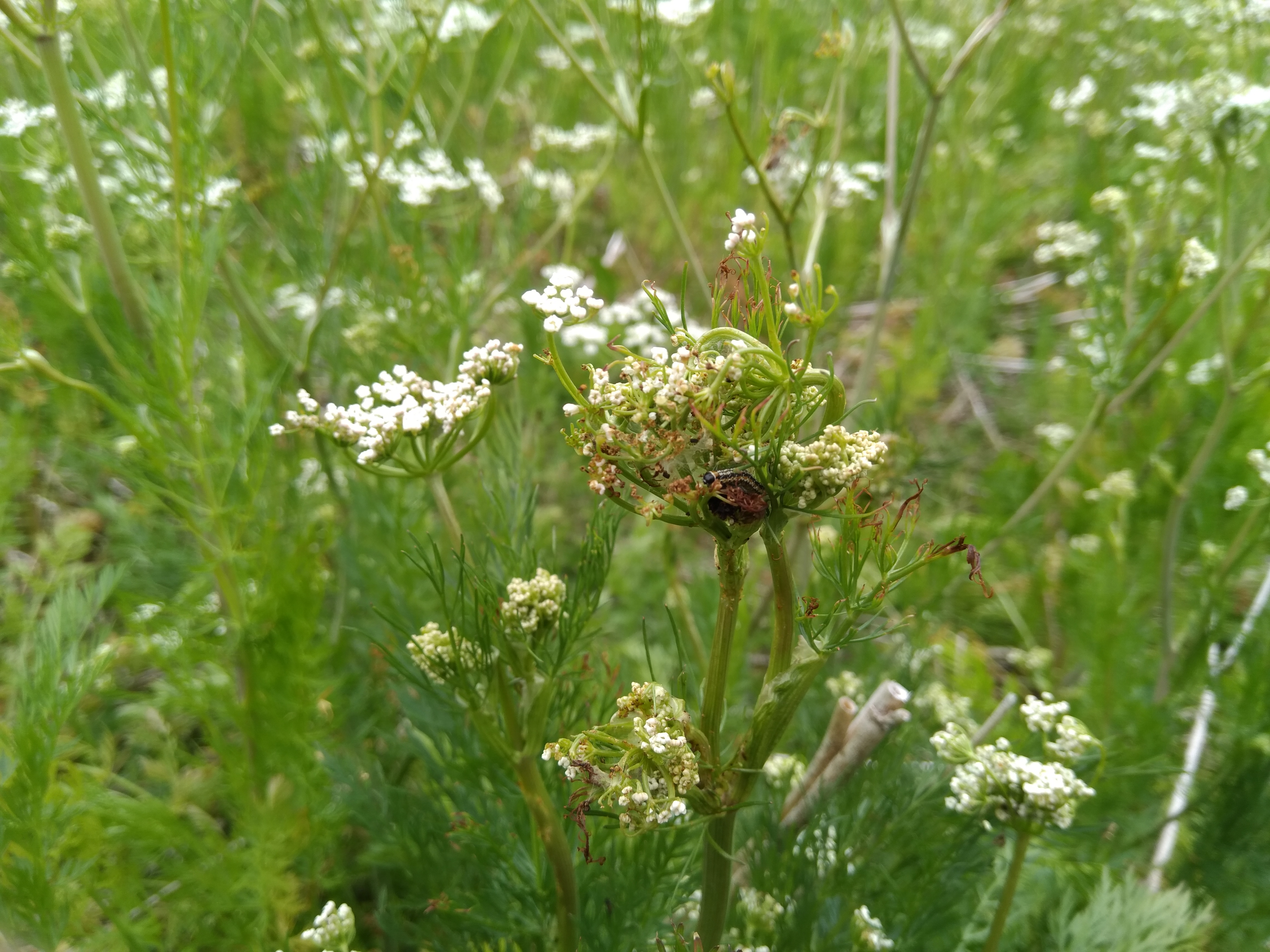 Kuminakoin toukat tekevät selvää jälkeä ruiskuttamattomalla kuminakoilohkolla. Viime päivien lämpö on kasvattanut kuminan kukkavarteen pituutta. Samalla avautumattoman kukinnon sisällä lymyävät kuminakoin toukat tuhoavat kiihtyvällä vauhdilla kukintaan valmistautuvia kukkanuppuja. Ensimmäiset koiruiskutukset on jo tehty.