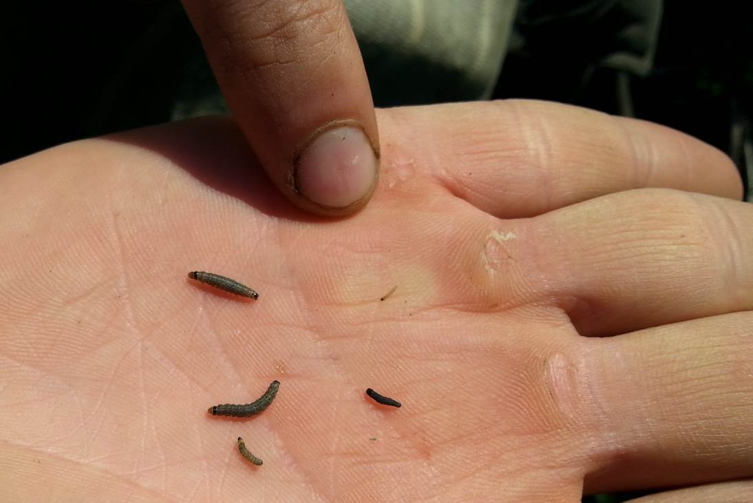 Nyt on korkea aika lähteä kuminamaalle tarkkailemaan toukkia. Kahlaa kasvustoon ja murra useampia avautumaisillaan olevia kukintoja. Toukkien ulkonäkö vaihtelee kehitysasteen mukaan, puolen sentin mittaisesta läpikuultavasta aina parin sentin mittaiseen kirjavaan ja pulleaan aikuiseen toukkaan. Jos löydät yhden toukan, on varmaa, että niitä on lisää. Torjuntakynnys on tällöin ylittynyt.