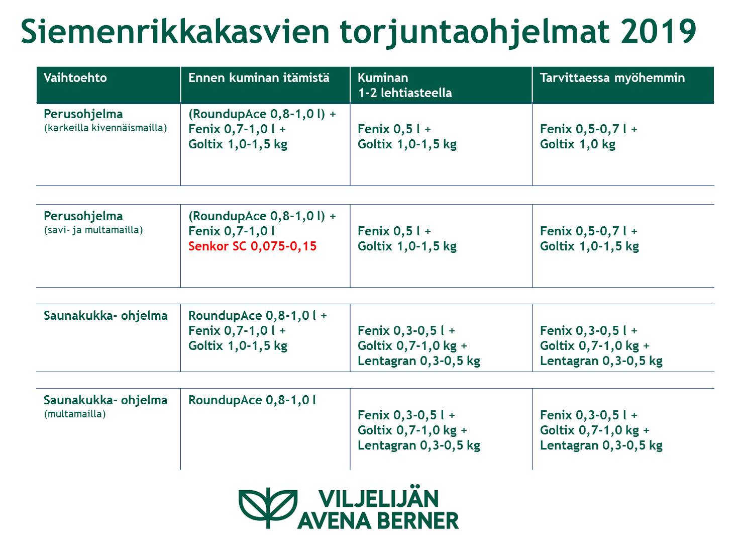 Hoida kasvinsuojelu jaetuin tankkiseoksin Viljelijän Avena Bernerin torjuntaohjelmilla, ne on käytännössä testattuja ja hyväksi havaittuja.