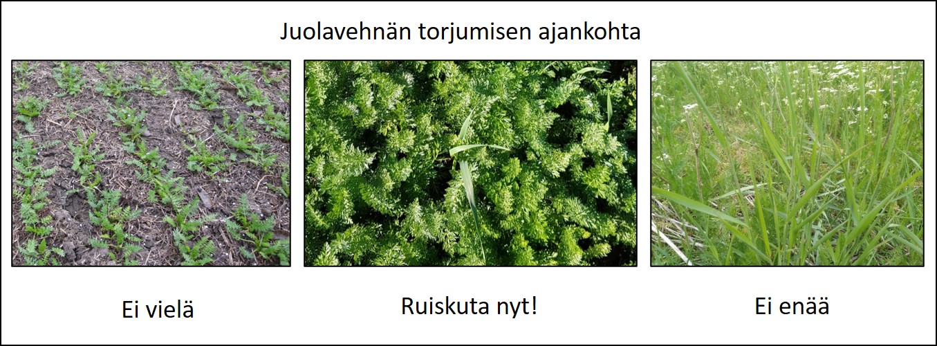 Juolavehnän voi ruiskuttaa sekä kylvö- että satovuonna. On syytä huomioida, että eri vuosille on sallittu osin eri aineet. Varmista siis hyväksyntä ja muista etenkin satovuonna, että valmisteilla on pitkä varoaika, 56 vrk.
