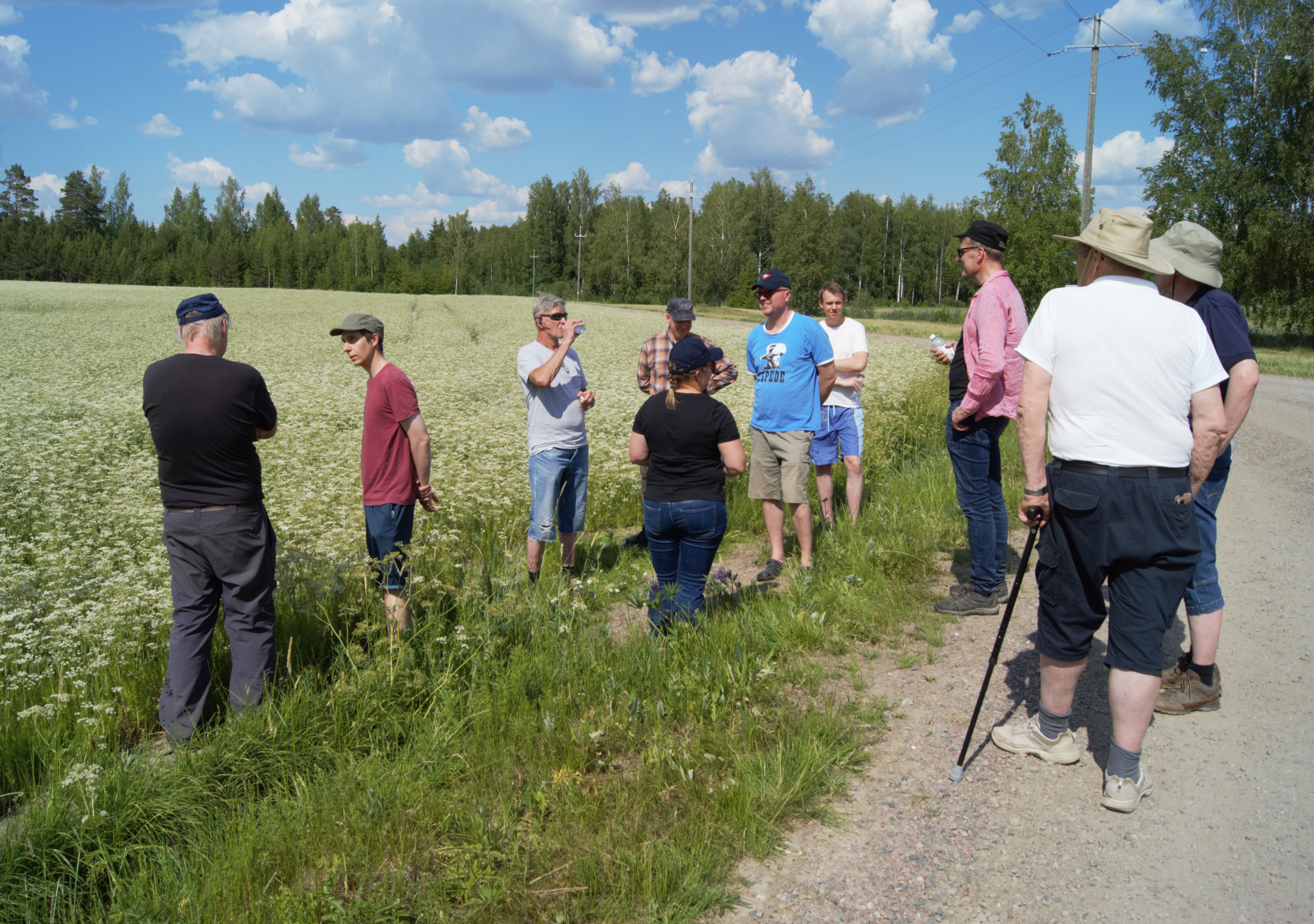 Kiertue startattiin 20.6. Mty Simanaisen hamppu- ja kuminalohkoilla Nurmijärvellä helteisissä tunnelmissa. Paikalle löysi kuumuudesta huolimatta tiensä runsaslukuinen kävijäkunta, jonka kanssa nautittiin kahvitarjoilusta, tutustuttiin öljyhampun virallisiin lajikekokeisiin ja toivottiin sateita. Vaikka kumina kukki vielä kauniisti, Nurmijärvellä kukinta oli hiljalleen lähestymässä loppuaan. Simanaisen kuminalohkoilla ei ollut juurikaan havaittu kuminakoita. Kuivuuden vaikutus näkyi erityisesti öljyhampulla, joka oli vielä melko matalaa, mutta aloittanee voimakkaan kasvun heti vettä saatuaan.